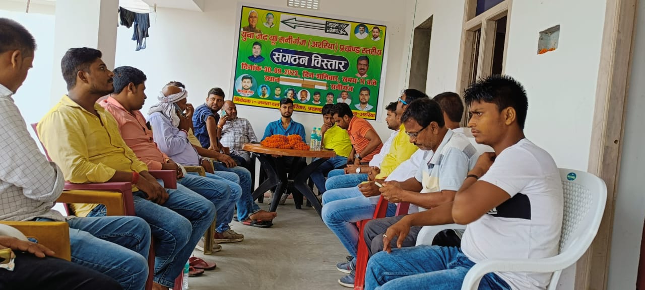 आशा ही नहीं पूर्ण विश्वास है कि आपलोग पार्टी को मजबूत बनाने में अपने दायित्वों का निर्वहन ईमानदारी पूर्वक करेंगे एवं माननीय मुख्यमंत्री श्री नीतीश कुमार जी के विकासात्मक कार्यों को आमजन तक पहुंचाकर अधिक से अधिक युवाओं को संगठन से जोड़ेंगे । बैठक मे मुख्य रूप से युवा जदयू के इम्तियाज़ भारती, राजू मंडल, मनीष कुमार, प्रिंस कुमार, आदित्य मंडल, इम्तियाज़ अंसारी, नौरेज आलम, मिथलेश ऋषिदेव,अनुज कुमार, रिकेष कुमार, मो एकराम, बेचन आलम, संजय सिंह,